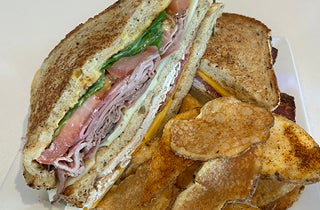It's made with layers of Smoked Turkey, savory Black Forest Ham, Crispy Bacon, Sharp Cheddar, Swiss Cheese, Sourdough Bread, Lettuce, Tomato, Mayo, and Honey Mustard. $14